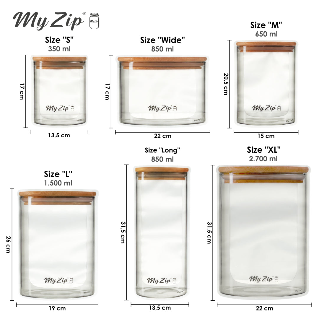 De MyZip-zakjes zijn ontworpen om aanzienlijk langer mee te gaan dan traditionele wegwerpverpakkingen. Ze kunnen vele malen worden hergebruikt en zijn net zo veelzijdig. Je MyZip-zakjes zien er niet alleen goed uit en dienen als praktisch en ruimtebesparend alternatief voor potten - nee, ze zijn ook de ideale metgezel bij het winkelen in de supermarkt of onverpakte winkel. Met zes verschillende maten heb je altijd de juiste maat bij je. Het praktische: uw MyZip-zakjes zijn ongevuld zo klein en licht dat u ze overal mee naartoe kunt nemen.